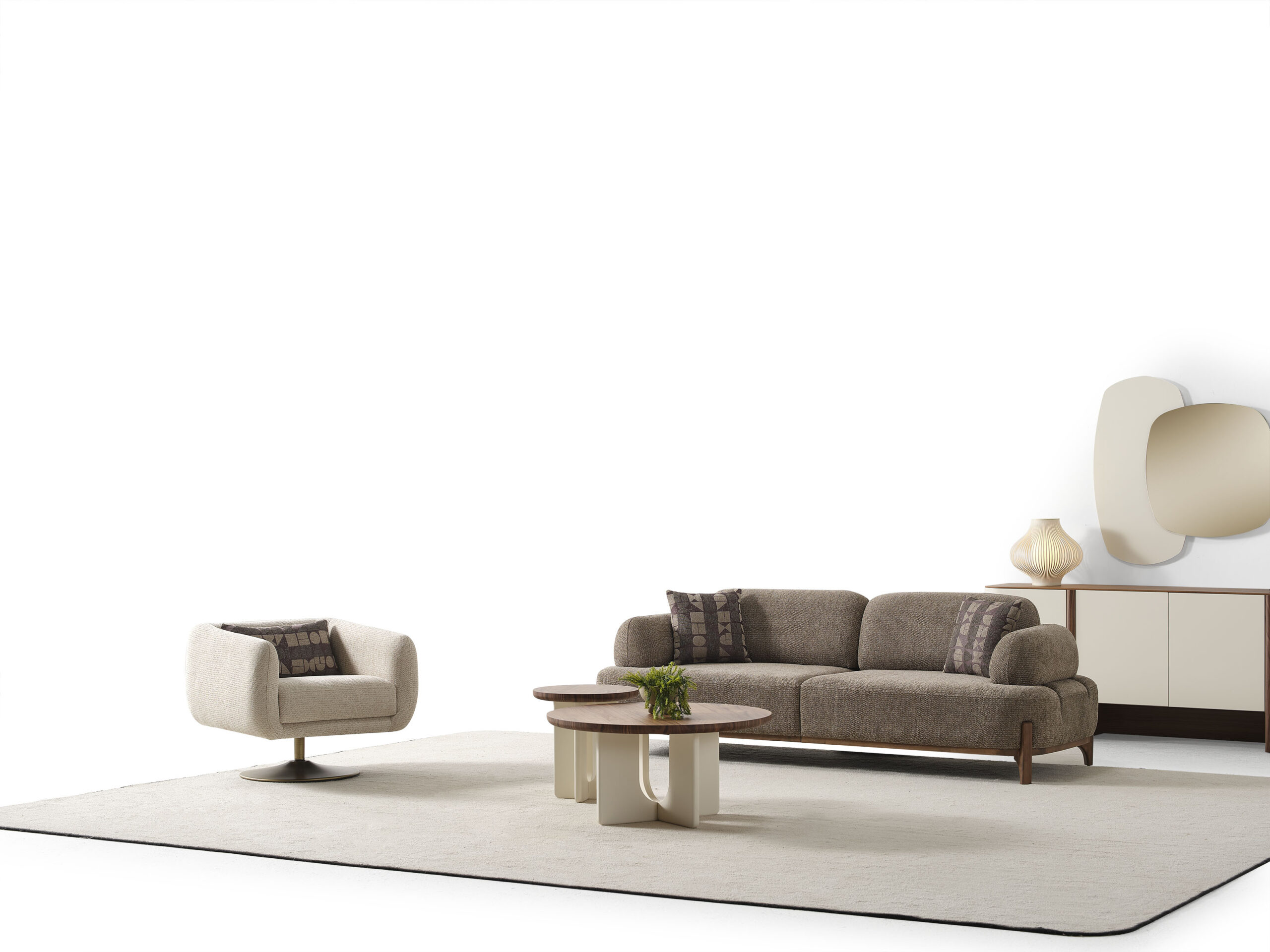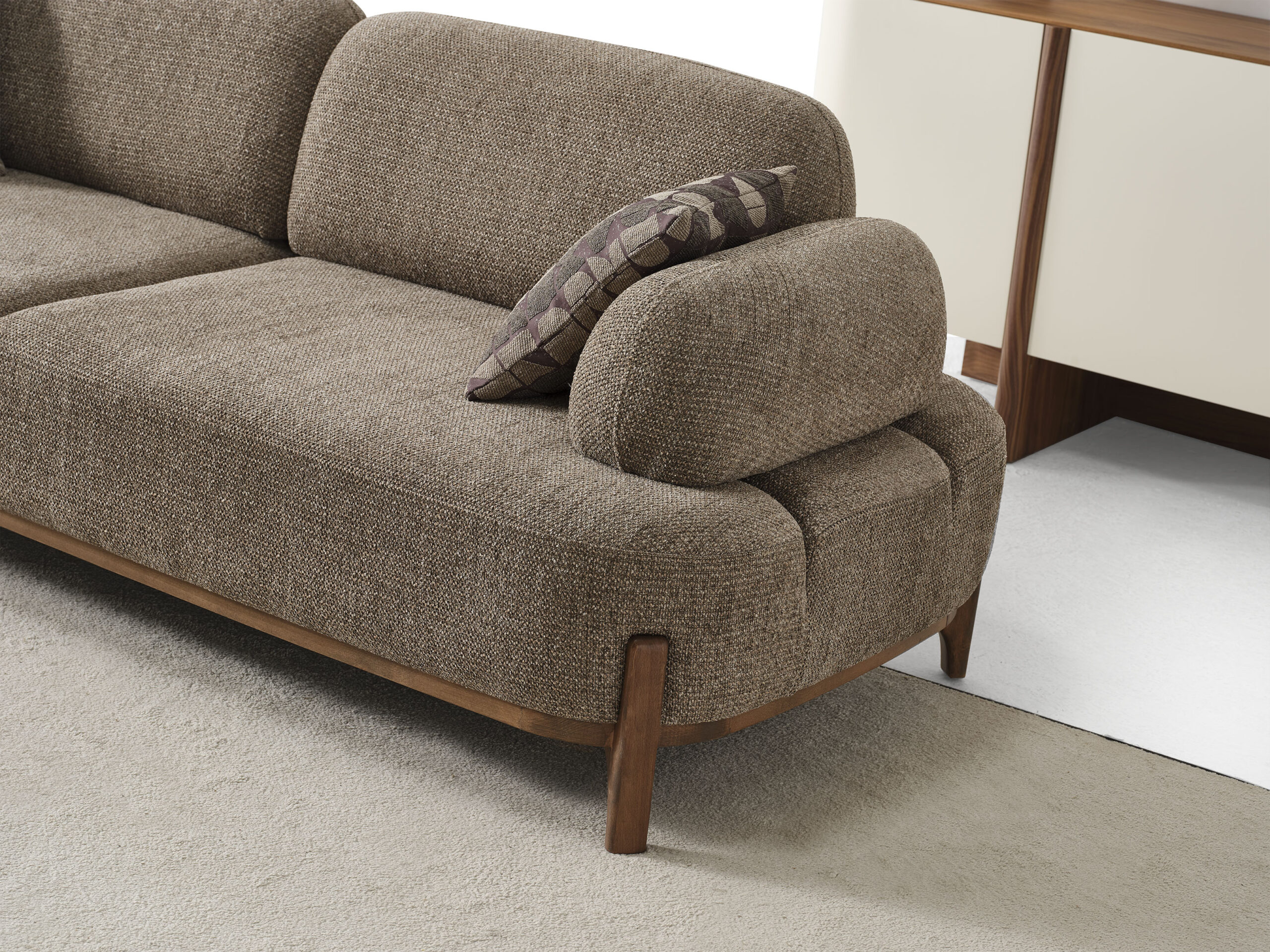 Wohnlandschaft in eleganter Form – eine Sitzgruppe „Ahuse Ceviz Sitzgruppe 3+3+1“ zum Wohlfühlen. Diese großzügige wohnlandschaftliche Sitzgarnitur punktet mit eleganter Optik und bietet Ihnen viel Platz für Familie und Freunde. Ein Sitzbezug aus dem hochwertigen, formstabilen und atmungsaktiven Bedeckung in eleganter Form verleiht dem Sofa stilvolle Eleganz und weich gepolsterten Zier- und Rückenkissen sitzen Sie jederzeit bequem. Die robusten, verzierten Füße fügen sich harmonisch ins Gesamtbild ein. Der durchgehend mit Echtstoff bezogene Rückenseite ermöglicht Ihnen ein freies Platzieren ganz nach Ihren Wünschen. Gönnen Sie sich diese tolle Wohnlandschaft für Ihr Wohnzimmer! Bezugsstoff steht in verschiedenen Farbvarianten zur Auswahl.