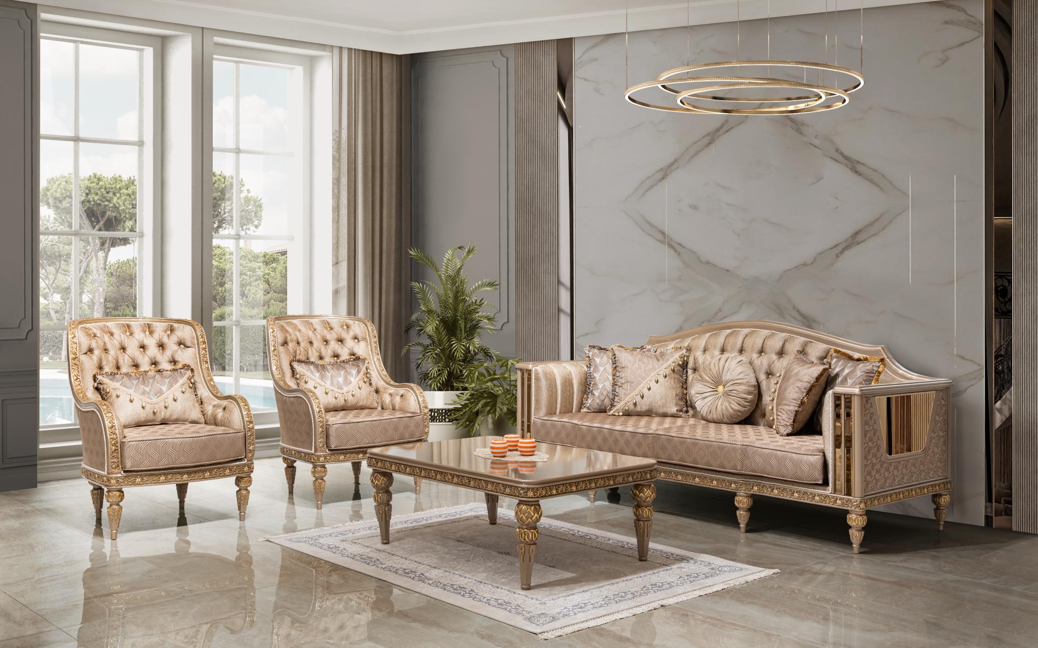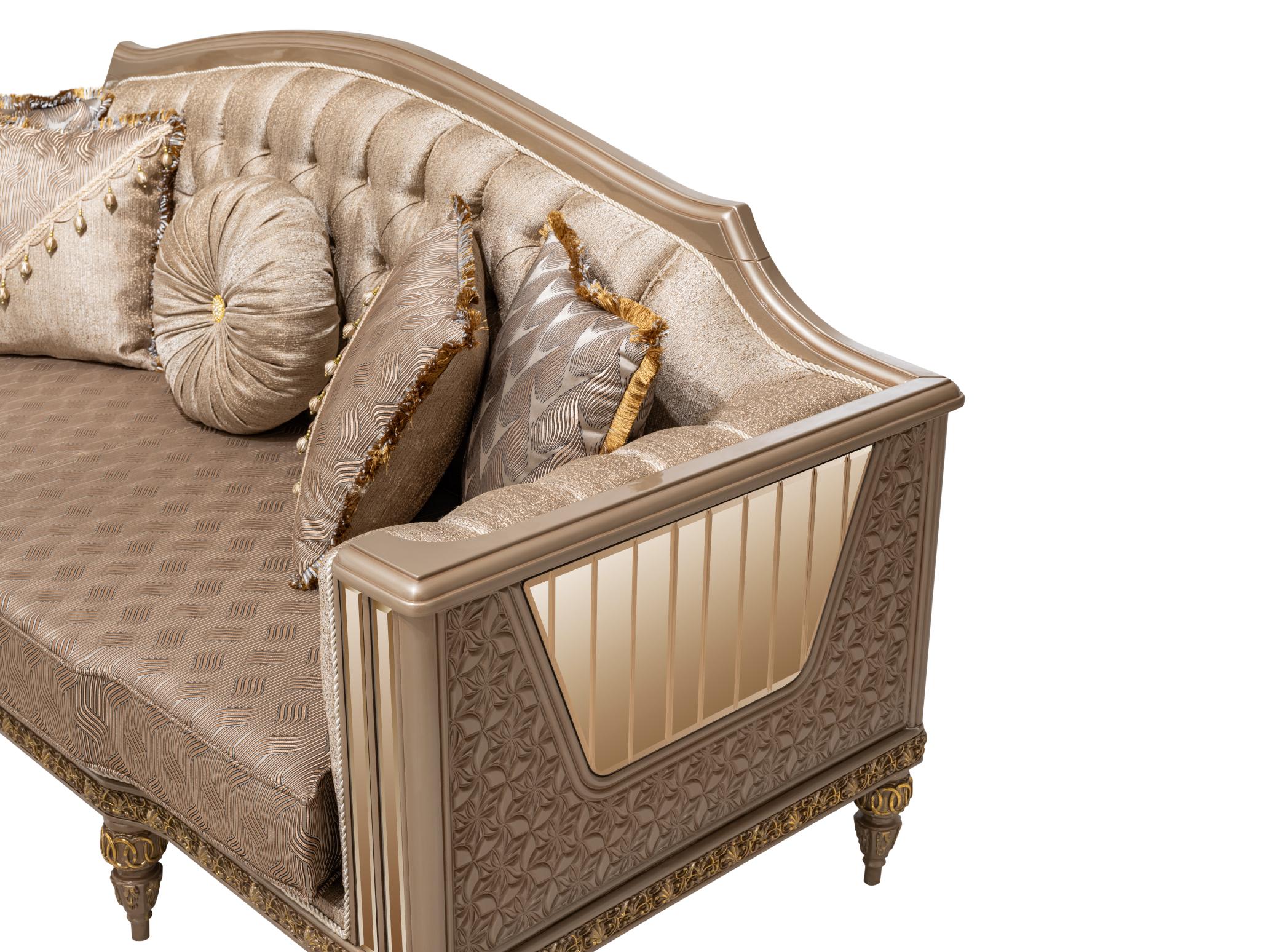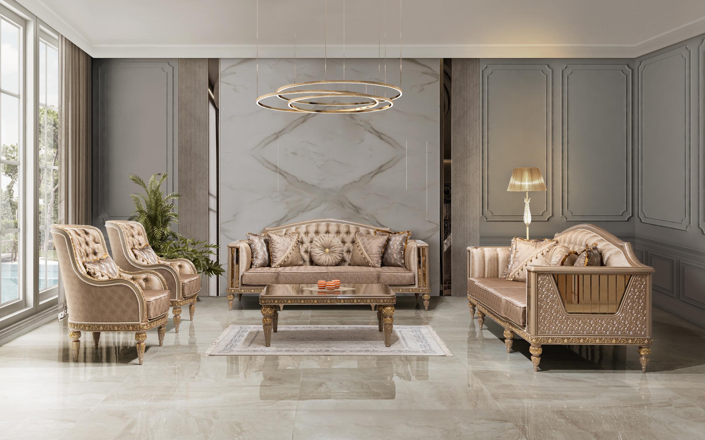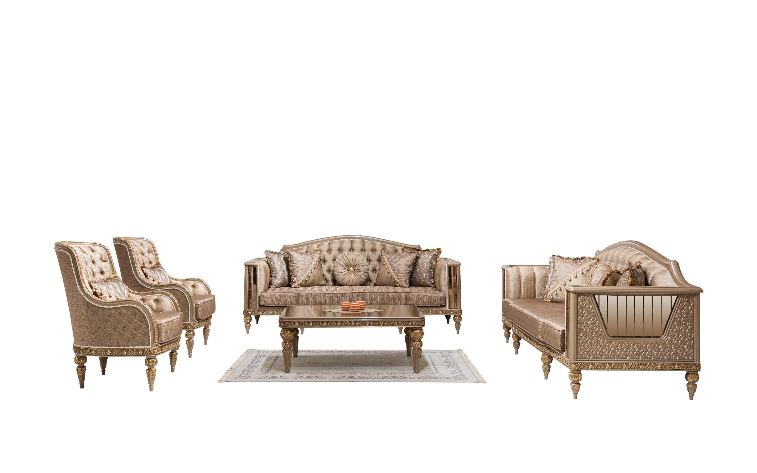Wohnlandschaft in eleganter Form – eine Sitzgruppe „Angora Avantgarde Sitzgruppe 3+3+1“ zum Wohlfühlen. Diese großzügige wohnlandschaftliche Sitzgarnitur punktet mit eleganter Optik und bietet Ihnen viel Platz für Familie und Freunde. Ein Sitzbezug aus dem hochwertigen, formstabilen und atmungsaktiven Bedeckung in eleganter Form verleiht dem Sofa stilvolle Eleganz und weich gepolsterten Zier- und Rückenkissen sitzen Sie jederzeit bequem. Die robusten, verzierten Füße fügen sich harmonisch ins Gesamtbild ein. Der durchgehend mit Echtstoff bezogene Rückenseite ermöglicht Ihnen ein freies Platzieren ganz nach Ihren Wünschen. Gönnen Sie sich diese tolle Wohnlandschaft für Ihr Wohnzimmer! Bezugsstoff steht in verschiedenen Farbvarianten zur Auswahl.