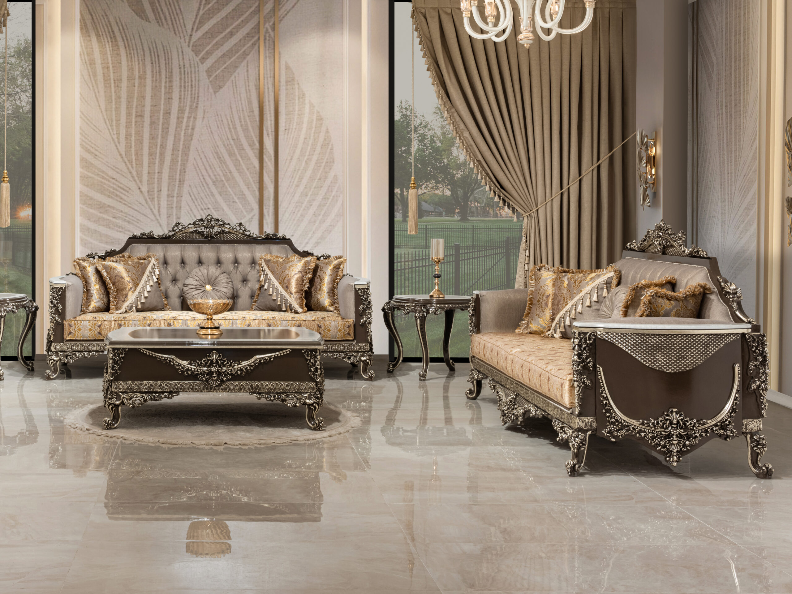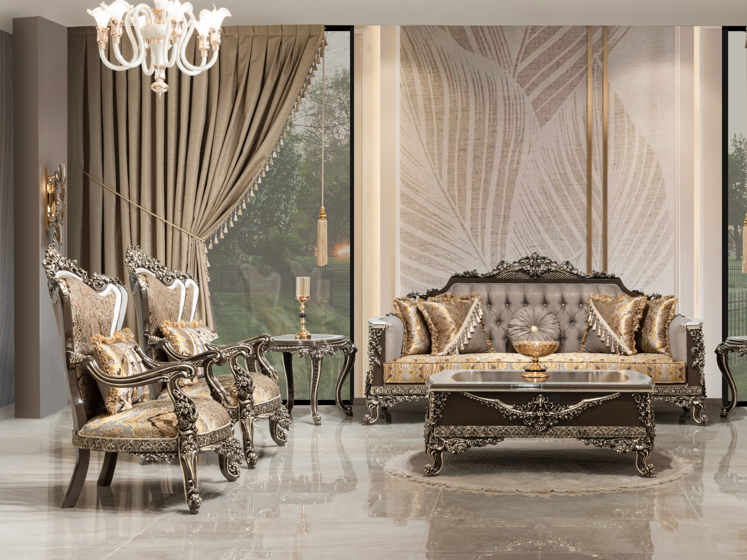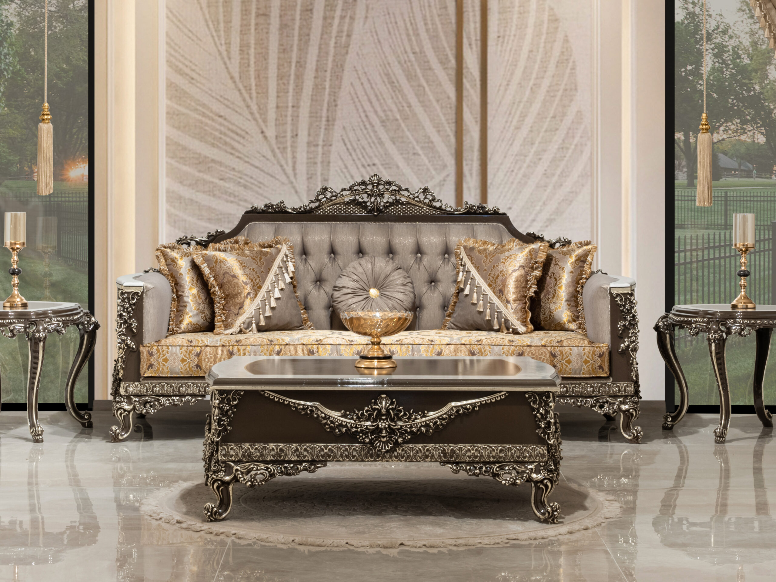 Wohnlandschaft in eleganter Form – eine Sitzgruppe „Cicek Avantgarde Sitzgruppe 3+3+1“ zum Wohlfühlen. Diese großzügige wohnlandschaftliche Sitzgarnitur punktet mit eleganter Optik und bietet Ihnen viel Platz für Familie und Freunde. Ein Sitzbezug aus dem hochwertigen, formstabilen und atmungsaktiven Bedeckung in eleganter Form verleiht dem Sofa stilvolle Eleganz und weich gepolsterten Zier- und Rückenkissen sitzen Sie jederzeit bequem. Die robusten, verzierten Füße fügen sich harmonisch ins Gesamtbild ein. Der durchgehend mit Echtstoff bezogene Rückenseite ermöglicht Ihnen ein freies Platzieren ganz nach Ihren Wünschen. Gönnen Sie sich diese tolle Wohnlandschaft für Ihr Wohnzimmer! Bezugsstoff steht in verschiedenen Farbvarianten zur Auswahl.