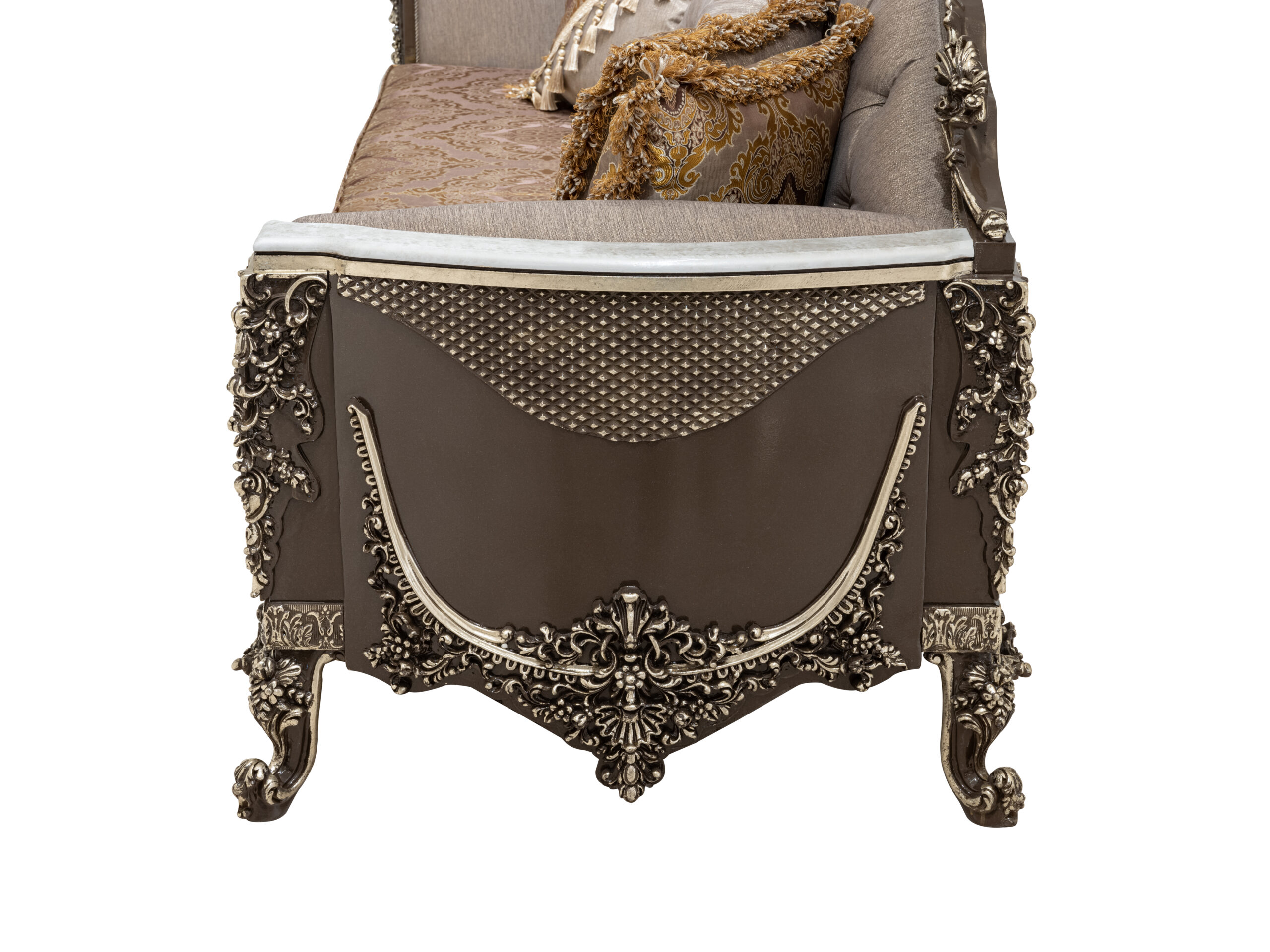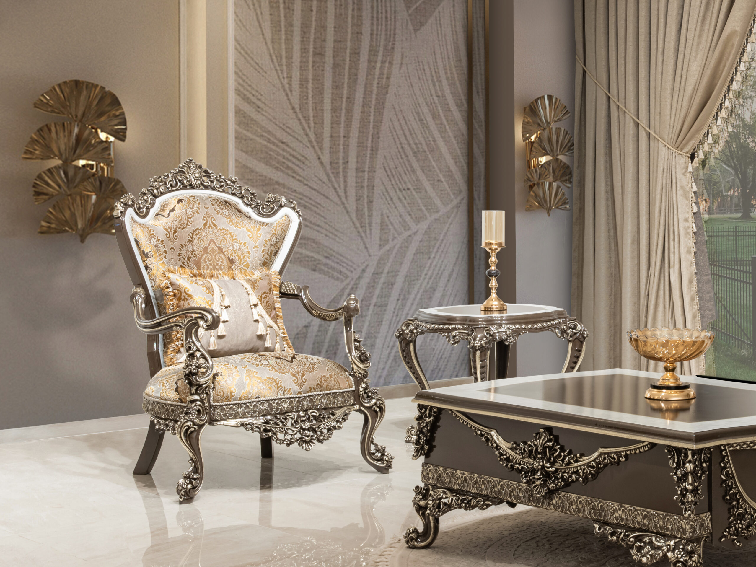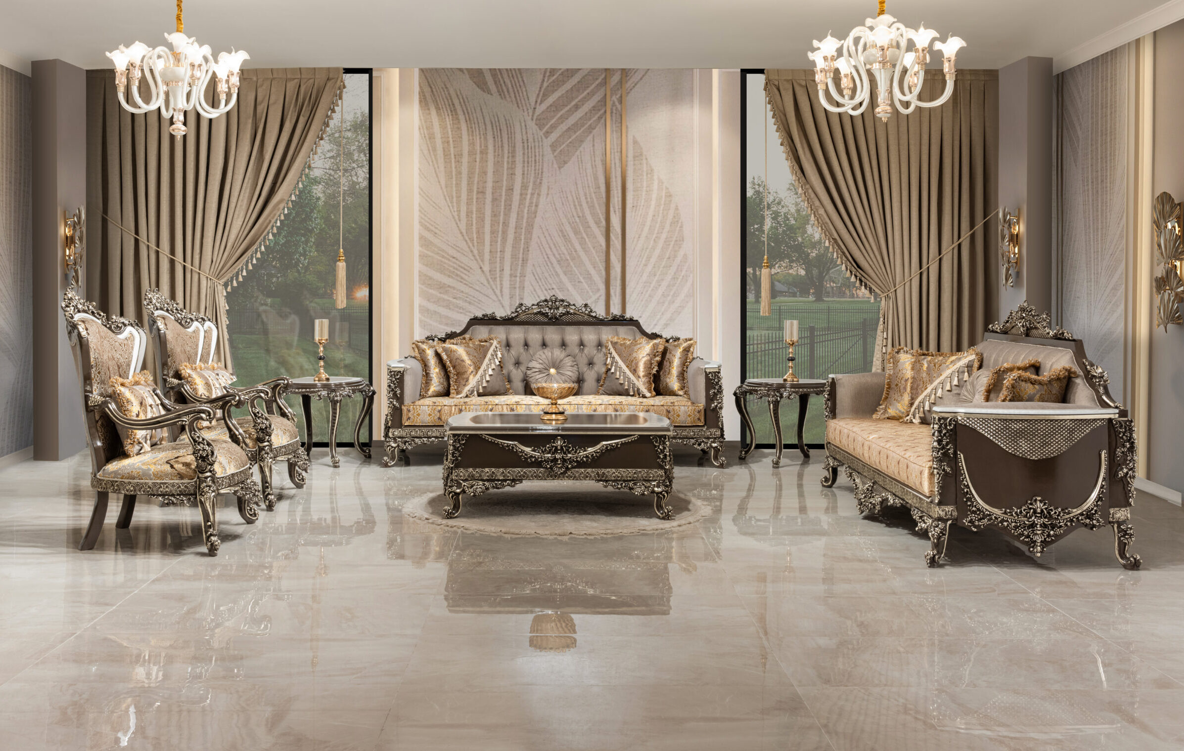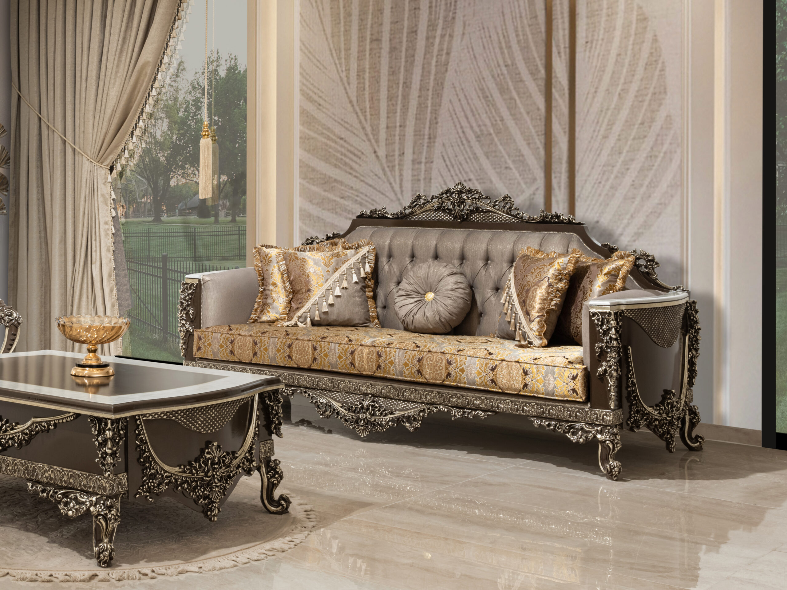 Wohnlandschaft in eleganter Form – eine Sitzgruppe „Cicek Avantgarde Sitzgruppe 3+3+1“ zum Wohlfühlen. Diese großzügige wohnlandschaftliche Sitzgarnitur punktet mit eleganter Optik und bietet Ihnen viel Platz für Familie und Freunde. Ein Sitzbezug aus dem hochwertigen, formstabilen und atmungsaktiven Bedeckung in eleganter Form verleiht dem Sofa stilvolle Eleganz und weich gepolsterten Zier- und Rückenkissen sitzen Sie jederzeit bequem. Die robusten, verzierten Füße fügen sich harmonisch ins Gesamtbild ein. Der durchgehend mit Echtstoff bezogene Rückenseite ermöglicht Ihnen ein freies Platzieren ganz nach Ihren Wünschen. Gönnen Sie sich diese tolle Wohnlandschaft für Ihr Wohnzimmer! Bezugsstoff steht in verschiedenen Farbvarianten zur Auswahl.