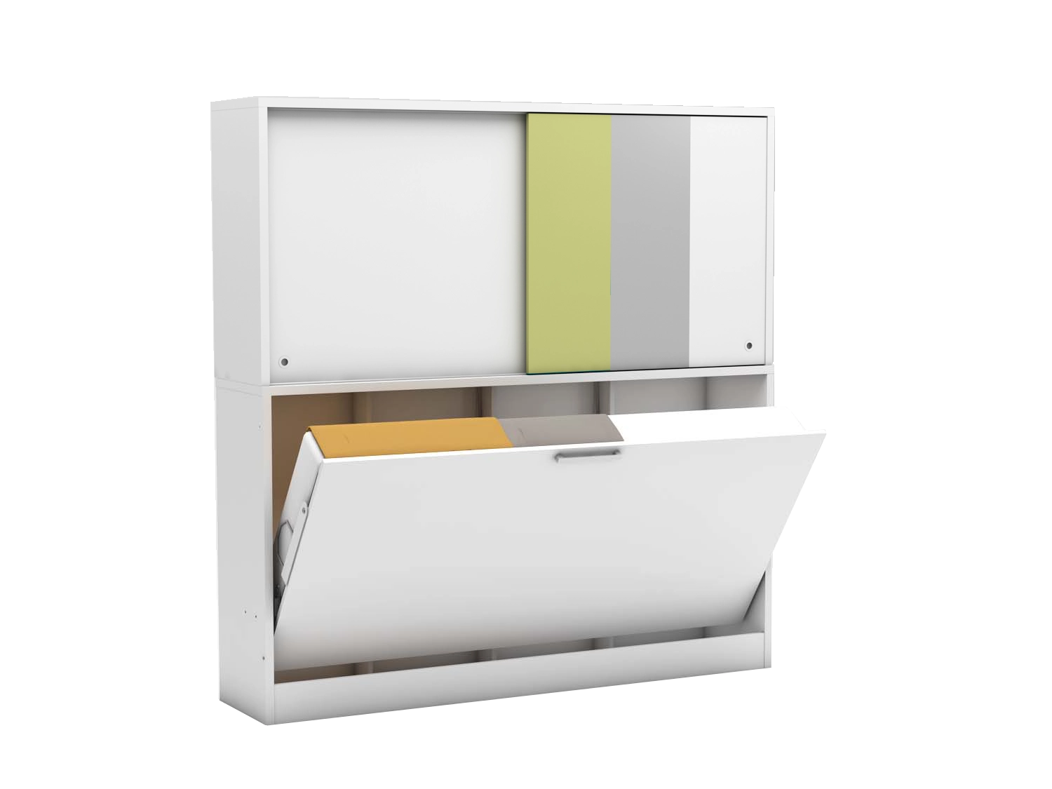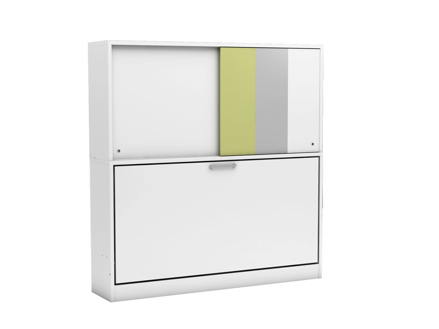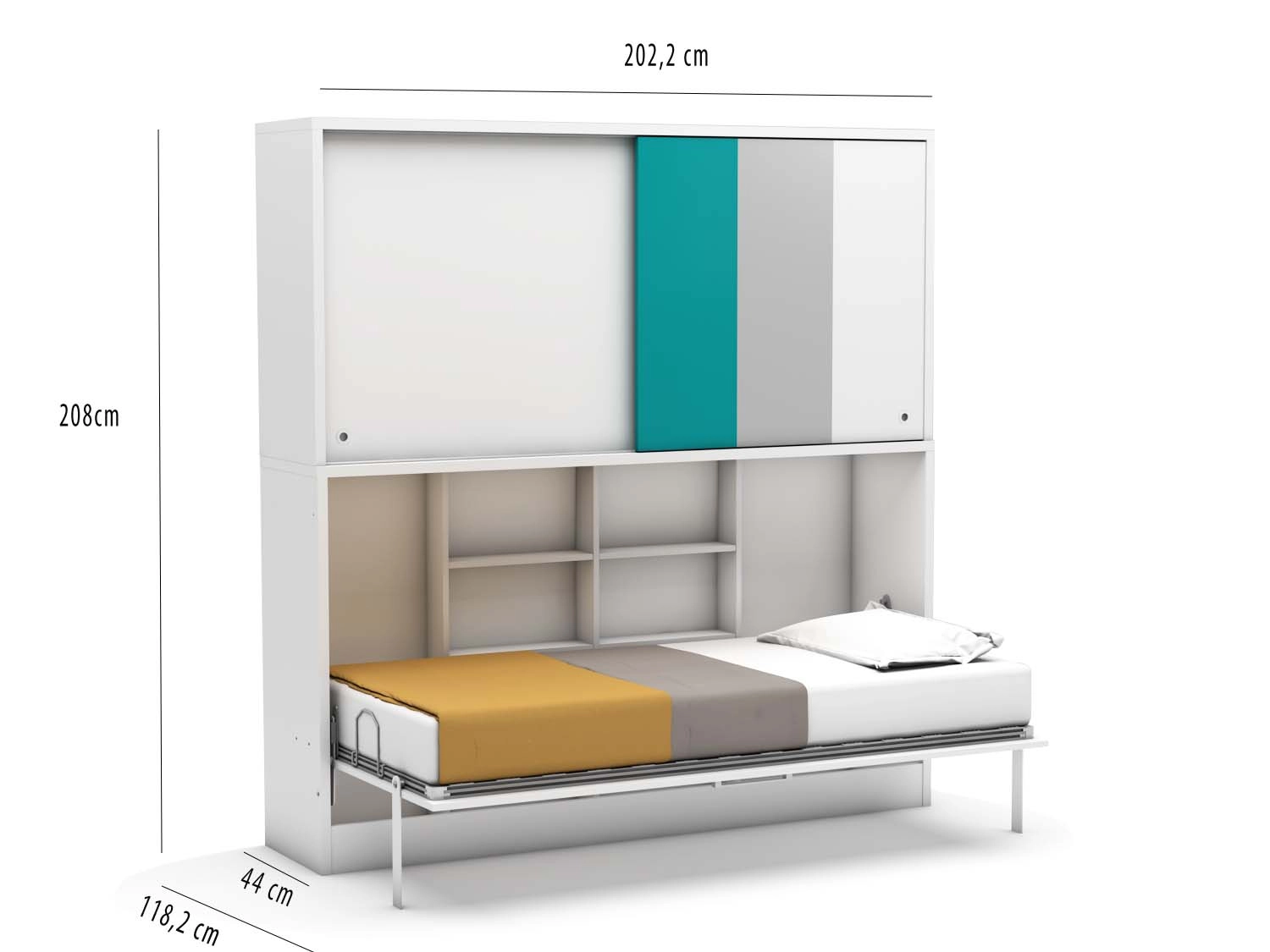 Das Schrankbett besteht aus: Klappbares Bett 90×190 cm, kleine Schiebetürschrank, Computertisch mit Regalen