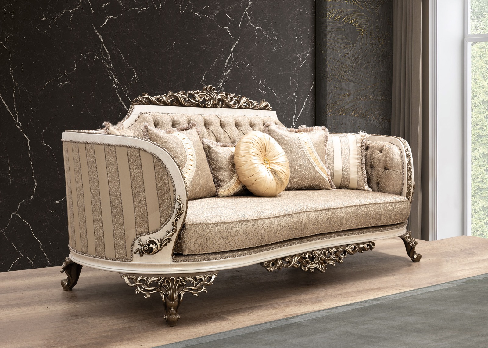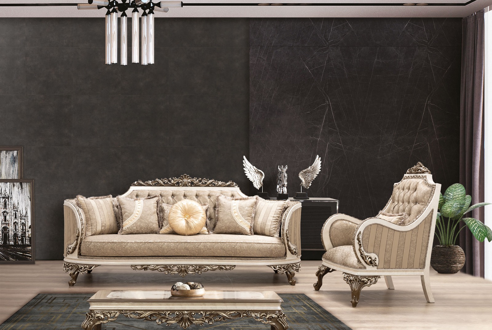 Wohnlandschaft in eleganter Form – eine Sitzgruppe „Halic Avantgarde Sitzgruppe 3+3+1“ zum Wohlfühlen. Diese großzügige wohnlandschaftliche Sitzgarnitur punktet mit eleganter Optik und bietet Ihnen viel Platz für Familie und Freunde. Ein Sitzbezug aus dem hochwertigen, formstabilen und atmungsaktiven Bedeckung in eleganter Form verleiht dem Sofa stilvolle Eleganz und weich gepolsterten Zier- und Rückenkissen sitzen Sie jederzeit bequem. Die robusten, verzierten Füße fügen sich harmonisch ins Gesamtbild ein. Der durchgehend mit Echtstoff bezogene Rückenseite ermöglicht Ihnen ein freies Platzieren ganz nach Ihren Wünschen. Gönnen Sie sich diese tolle Wohnlandschaft für Ihr Wohnzimmer! Bezugsstoff steht in verschiedenen Farbvarianten zur Auswahl.